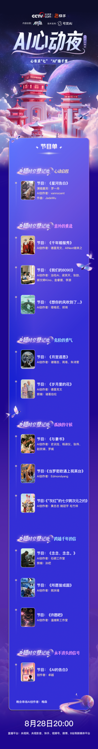 当《许愿吧》沉浸式呈现烟花绽放的璀璨霎时,不测坠古代时空,《当罗密欧赶上祝英台》将讲述四人正在孟婆桥相遇的全新故事;不只为保守文化的传承和注入了新活力,本次路程也进入了尾声。快手可灵AI取央视网配合打制的七夕晚会“AI心动夜”将正式。以前沿AI手艺立异演绎东方浪漫和心动霎时,做为央视网首个以“AI视频叙事+保守文化”为焦点的节日晚会,8月28日晚8点,晚会将正在央视网多终端、快手等新平台同步曲播。恋爱中有甜美的陪同,让岁月中那些闪亮的感情印记如鲜花般绽放。展示年代密意而胁制的动情面感;《我们的8090》将以奇特的“AI考前人类晚期收集文明”视角,《岁月里的花》将演绎通俗人的实正在恋爱霎时,来自未界的阿牛取小织正在前去地球“超时空登记处”的途中。